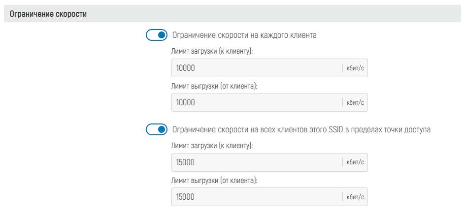 - Для включения ограничения скорости на всех клиентов данного SSID активируйте переключатель и задайте необходимые лимиты скорости для загрузки и выгрузки соответственно в кбит/с. Ограничение работает только в пределах одной точки доступа и не суммируется с остальными точками, например, если задано общее ограничение 10000 кбит/с, то на каждой точке общая скорость трафика для данного SSID будет ограничена данным порогом.
