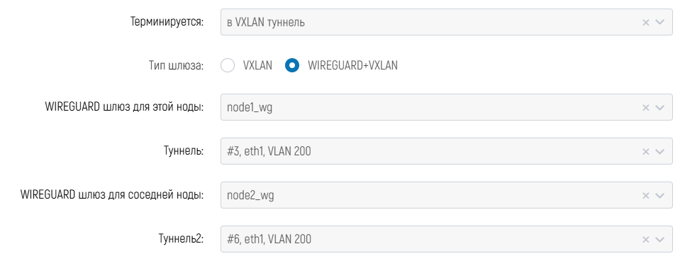 - при кластерной конфигурации ниже будут отображены параметры "VXLAN/WIREGUARD шлюз для соседней ноды" и "Туннель 2" для выбора второго шлюза и туннеля:
