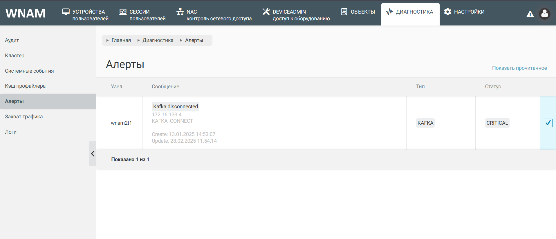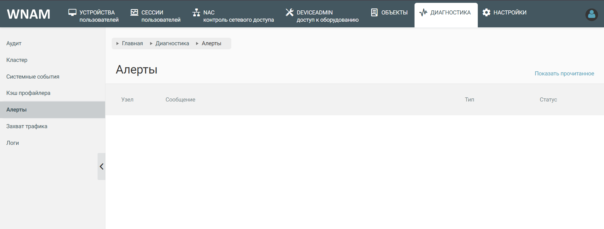 Раздел "Алерты" помогают администраторам видеть критичные события в работе системы WNAM 2. В случаях, когда происходит события, мешающих корректно работать общему состоянию системы, запись о нарушении работы системы будет переведена в данный раздел.