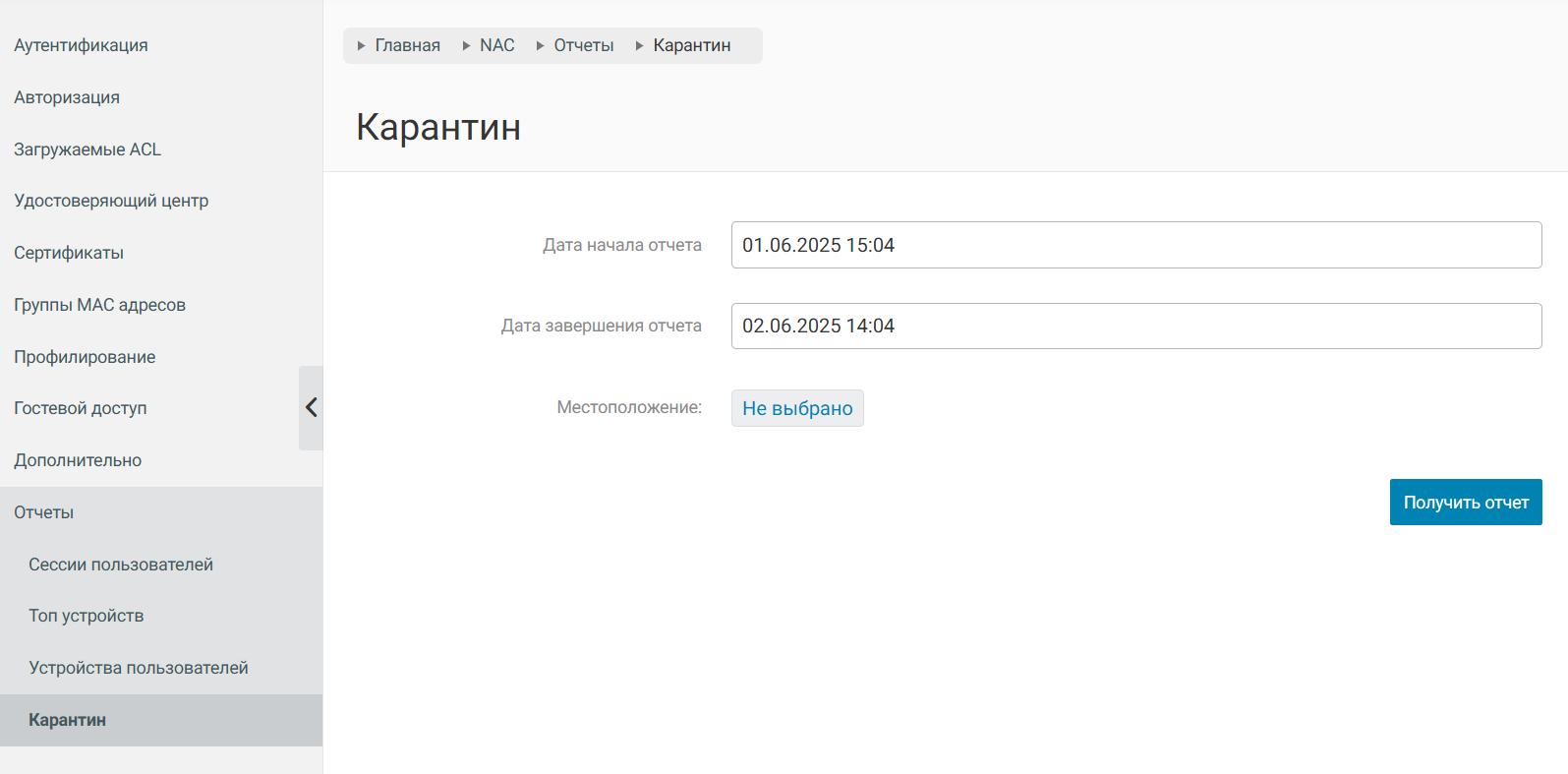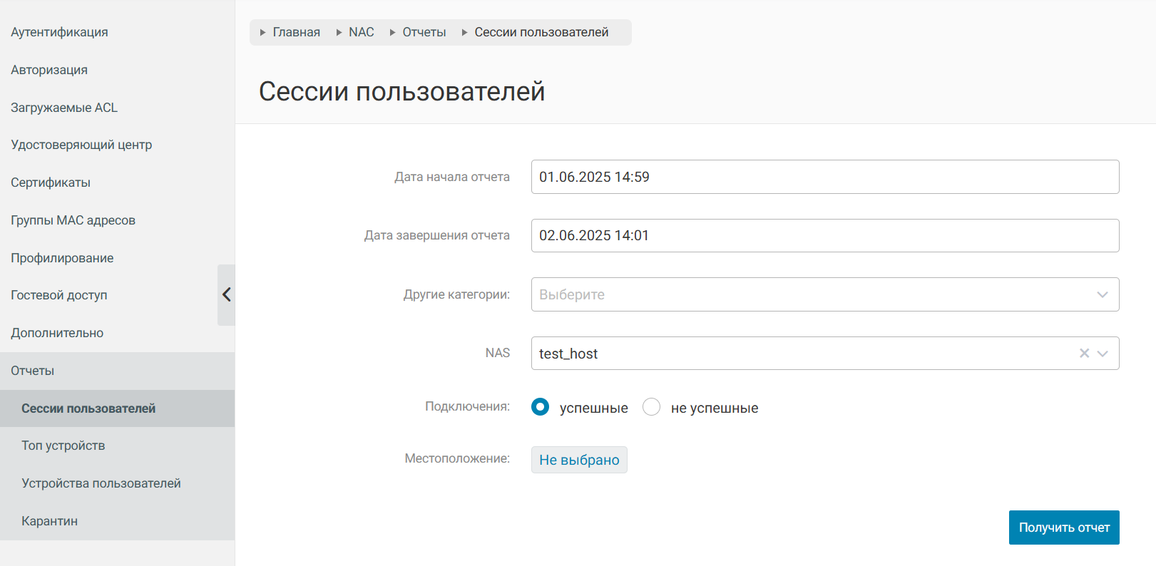 Отчёт показывает историю подключений пользователей с возможностью фильтрации.
