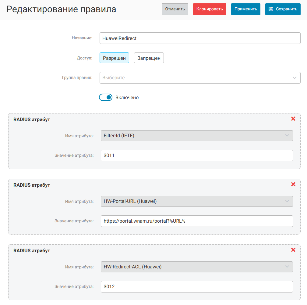 Также обращаем особое внимание, что причина половины случаев неработоспособности авторизации через контроллеры Huawei лежит в не-прописывании на межсетевых экранах разрешений доступа от сервера WNAM 2 до контроллера по udp:3799.