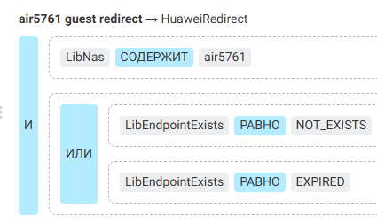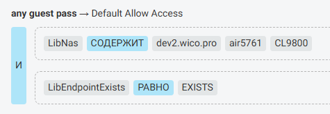 - Первое правило сработает для неизвестных/просроченных гостевых устройств, и вызовет отдачу Radius Access-Accept и необходимых атрибутов редиректа контроллеру.