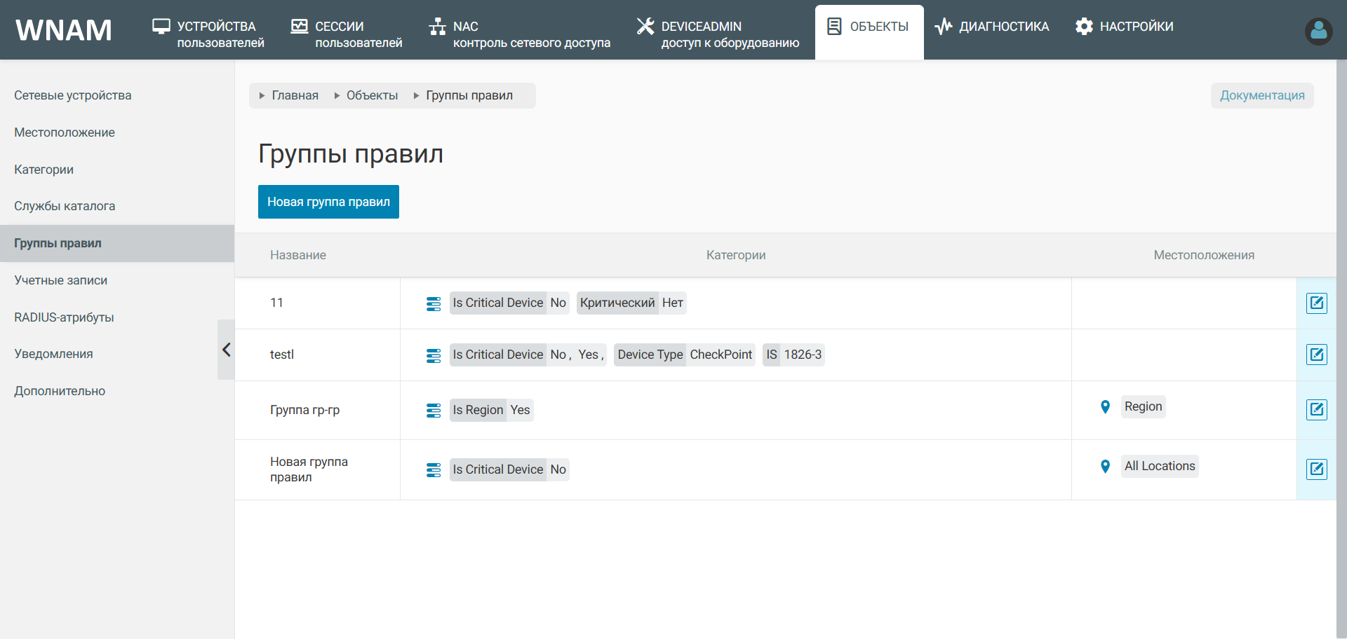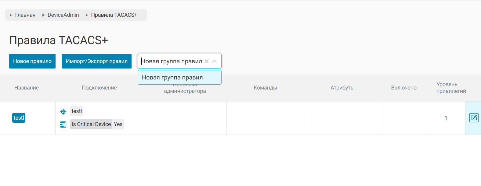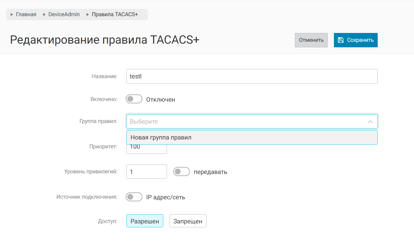 Также, группы правил позволяют объединять несколько правил TACACS+ или RADIUS.