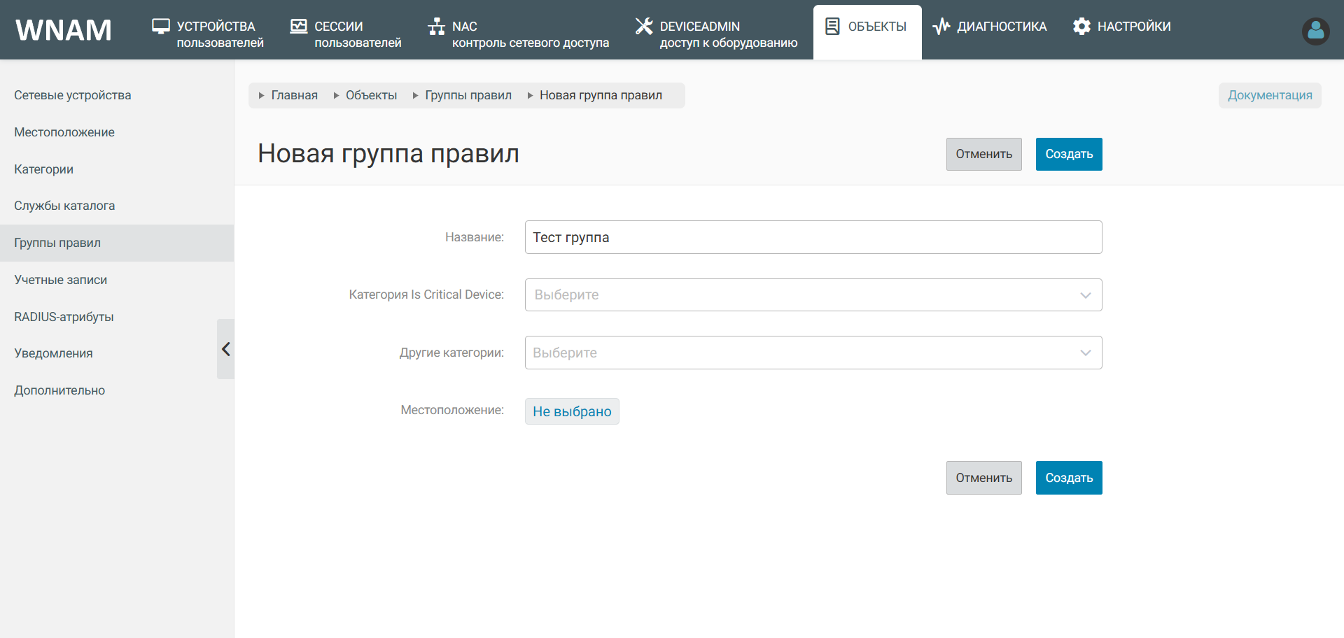 При создании групп правил достаточно указать только название, категории и указание местоположения является опциональным условием.