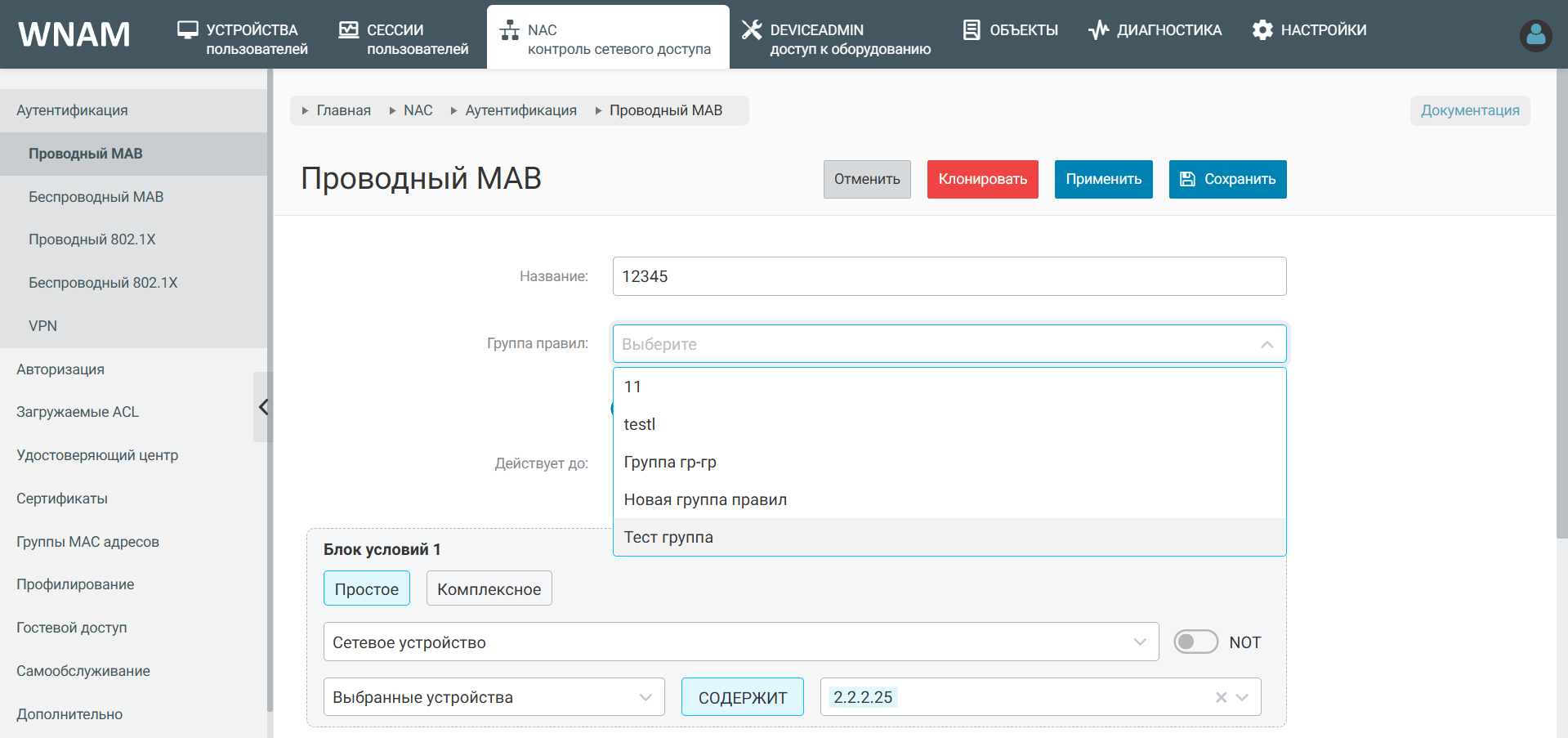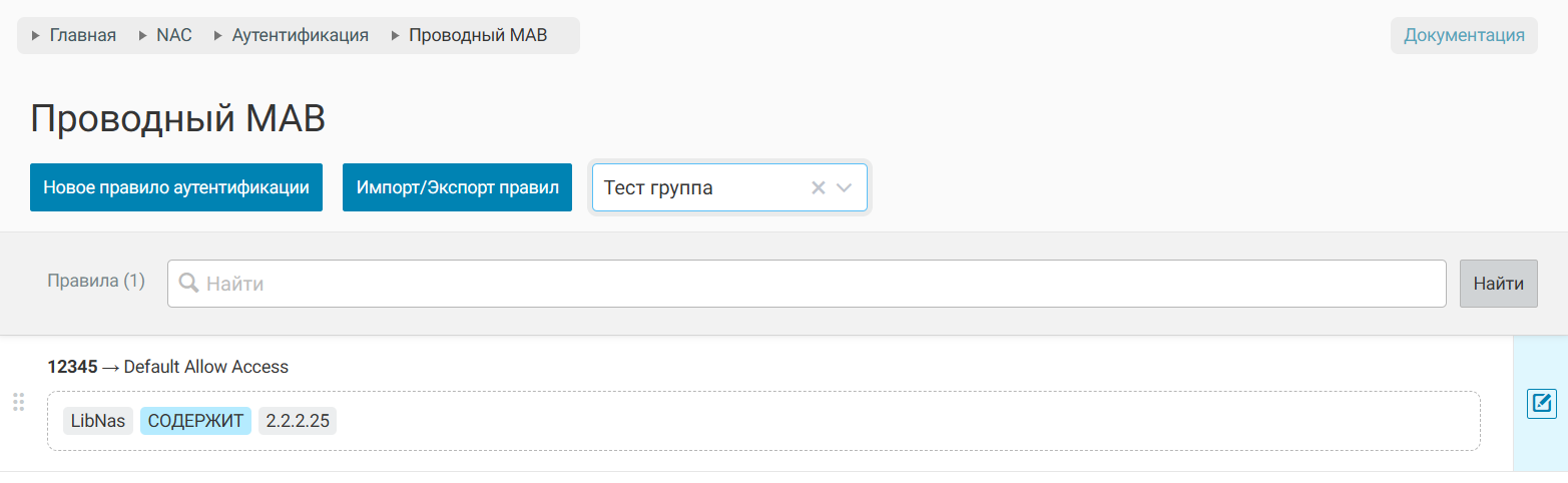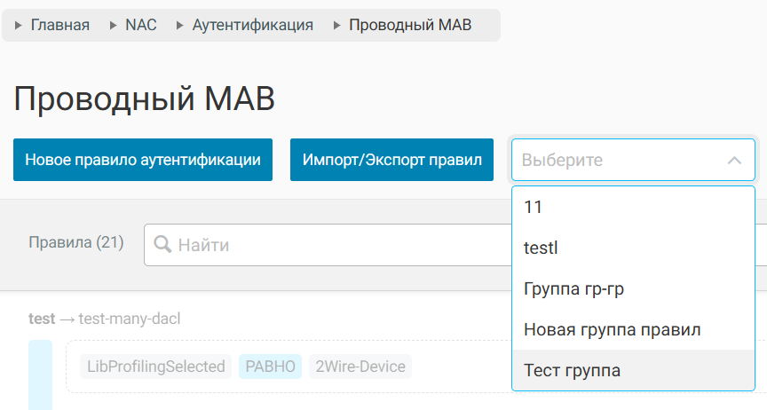 После создания группы правил, теперь при создании или редактировании правил аутентификации и авторизации возможно указать группу правил.