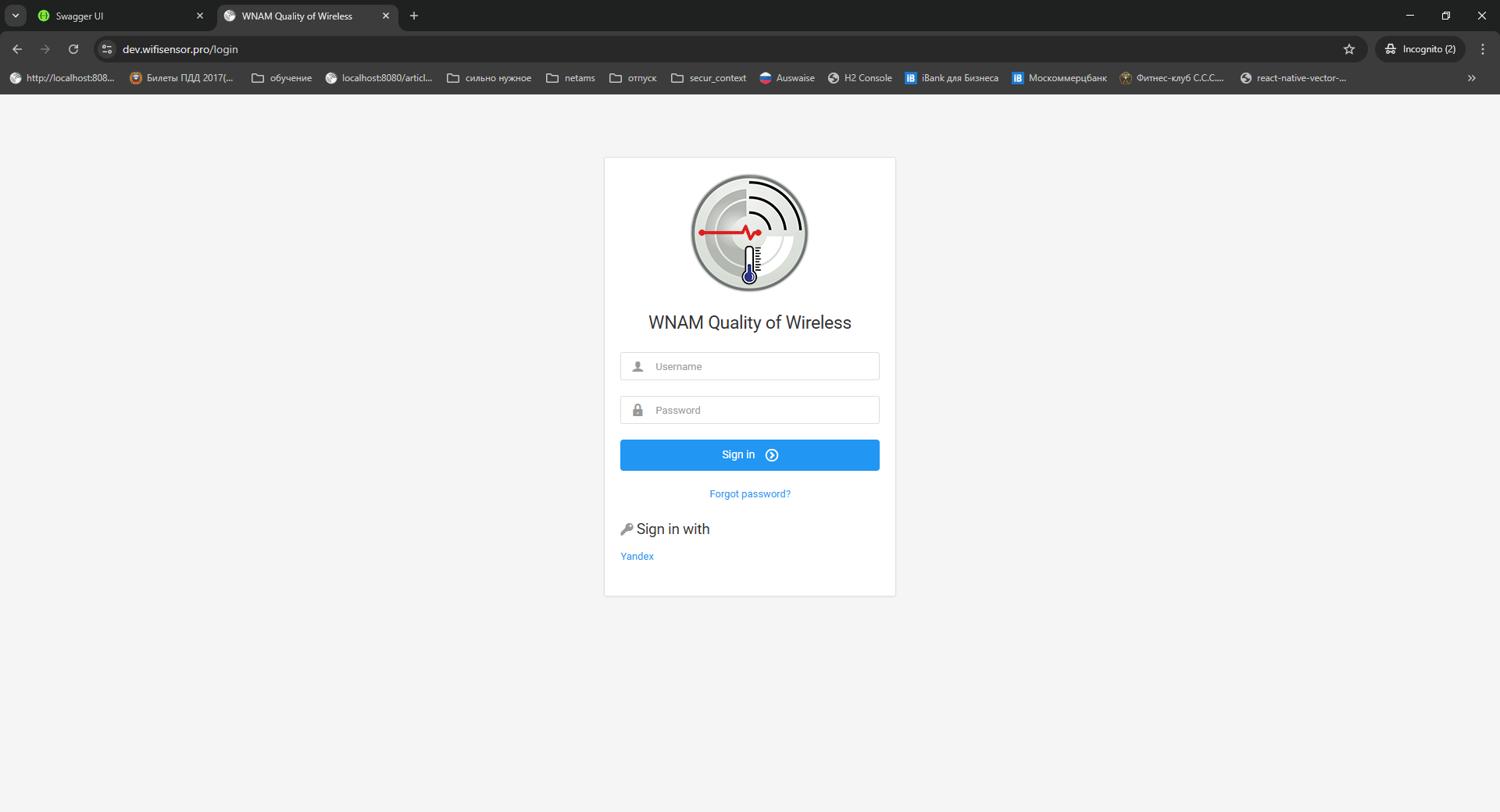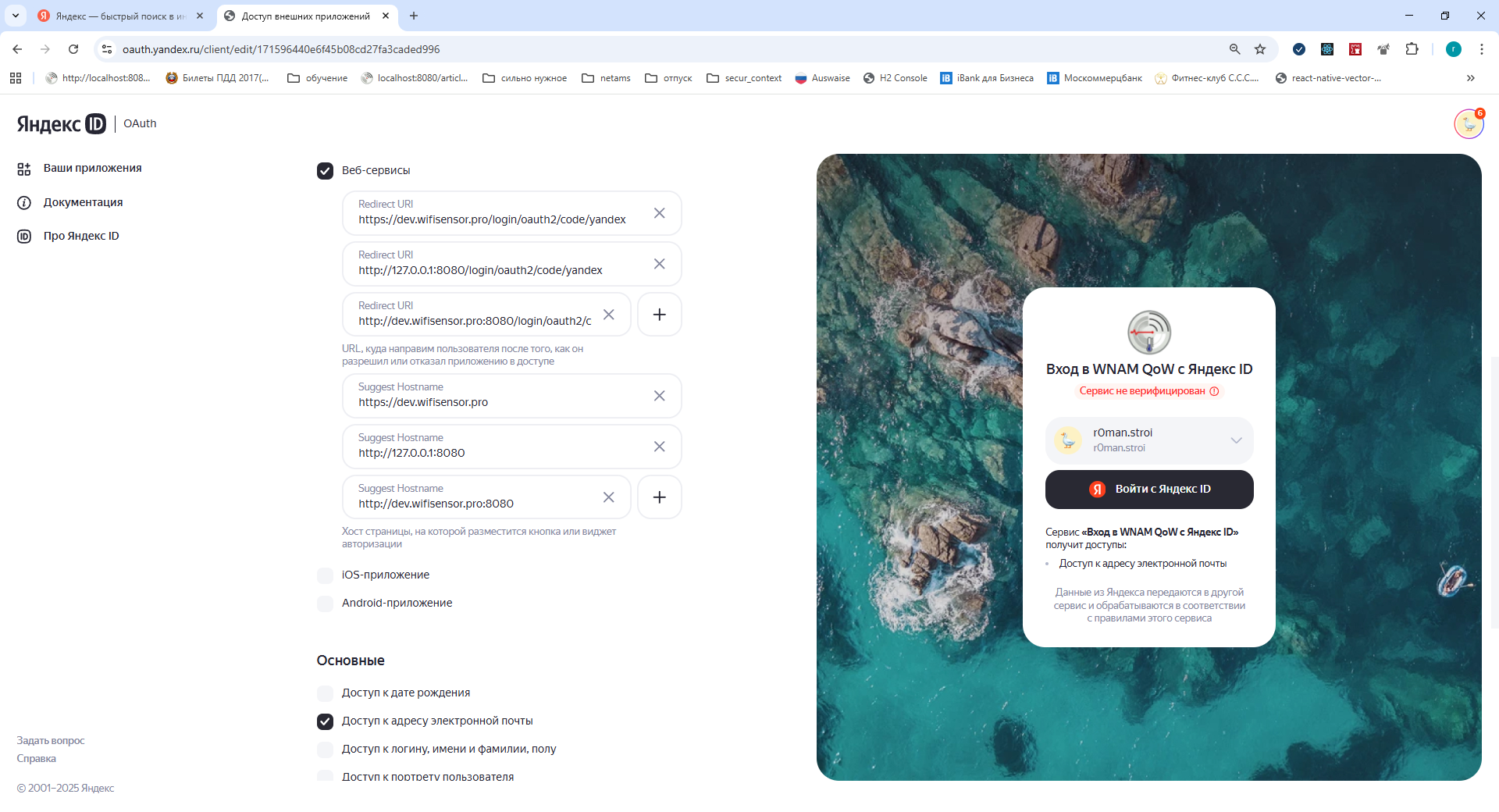 - RedirectURI: https://dev.wifisensor.pro/login/oauth2/code/yandex здесь https://dev.wifisensor.pro - адрес хоста сервера QoW, часть пути после "/code/" с текстом "yandex" - идентификатор провайдера SSO (Т.е. для локально работающего сервера значение параметра выглядит как http://127.0.0.1:8080/login/oauth2/code/yandex);