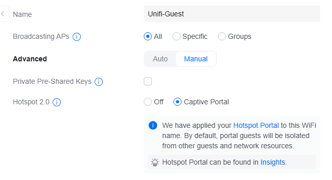 - Создайте гостевой профиль SSID, в режиме Open, без портальной авторизации. Проверьте клиентские подключения в нём. Убедитесь, что всё (DHCP, DNS, маршрутизация, NAT) полностью работают.