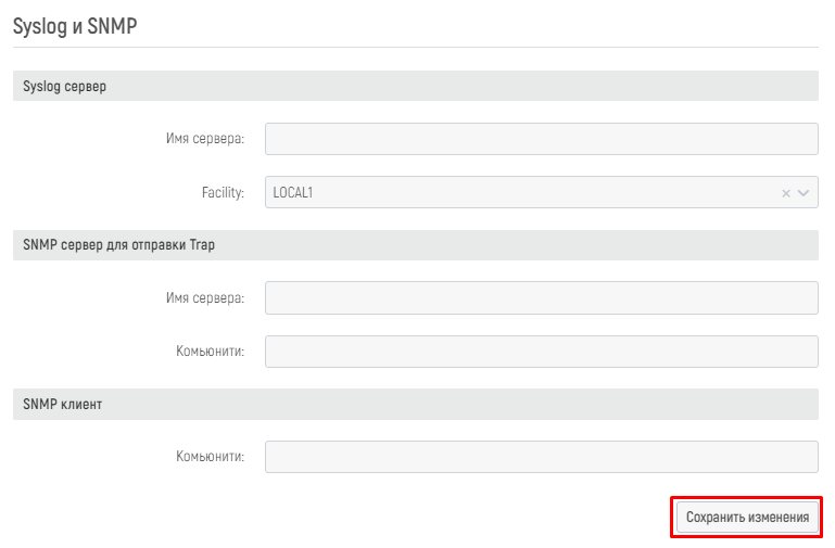 Для сохранения изменений, внесённых в настройки Syslog и SNMP, нажмите кнопку "Сохранить изменения". При успешном сохранении изменений появится модальное окно "Изменения сохранены" с информацией о том, что данные успешно записаны. Для закрытия модального окна нажмите кнопку "Вернуться" или "". Если при сохранении изменений были допущены ошибки, то при нажатии на кнопку "Сохранить изменения" система проинформирует Вас об этом, выделив пустые поля цветом.