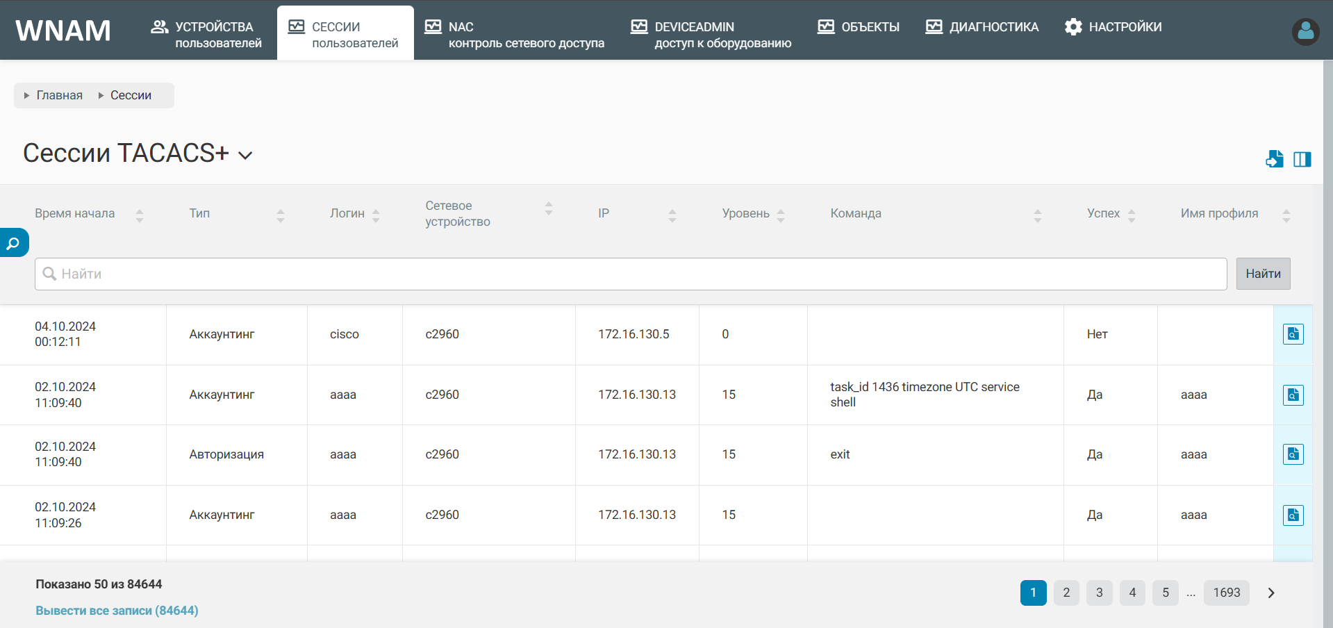 Функция поиска включает тонкие настройки по фильтрации записей сессий RADIUS: