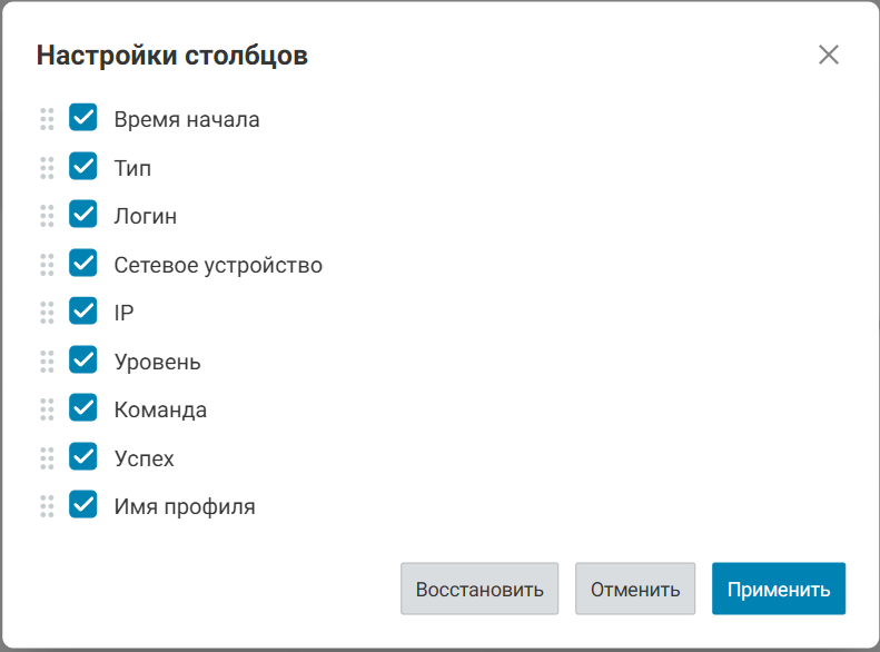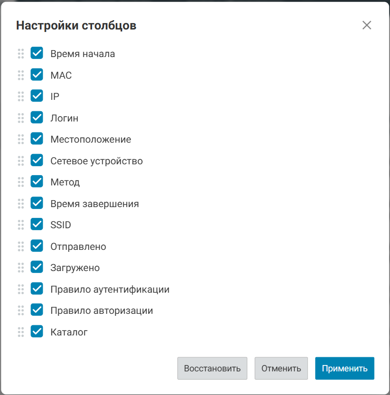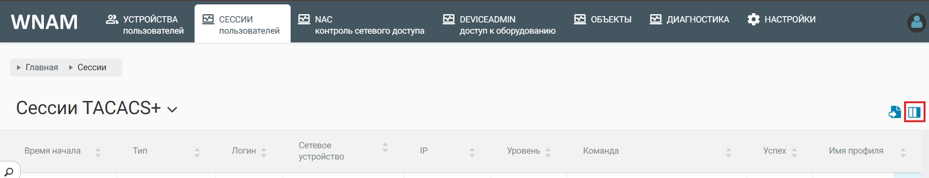 В зависимости от выбранной таблицы, настройки столбцов могут варьироваться. Так, для таблицы сессий TACACS+, настройки будут иметь вид: