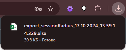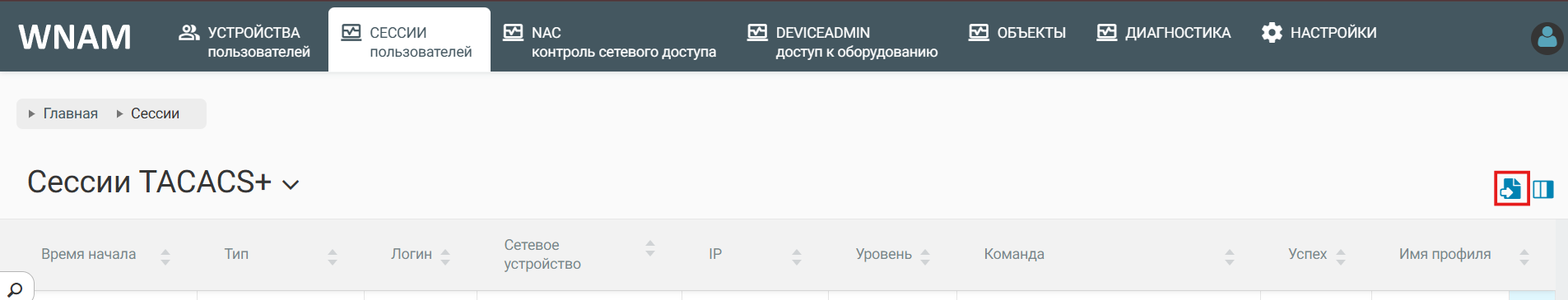 Данный вид настроек отображения можно применить как к таблице сессий TACACS+, так и к таблице сессий RADIUS. Для экспорта требуемой таблицы необходимо выбрать функцию экспорта: