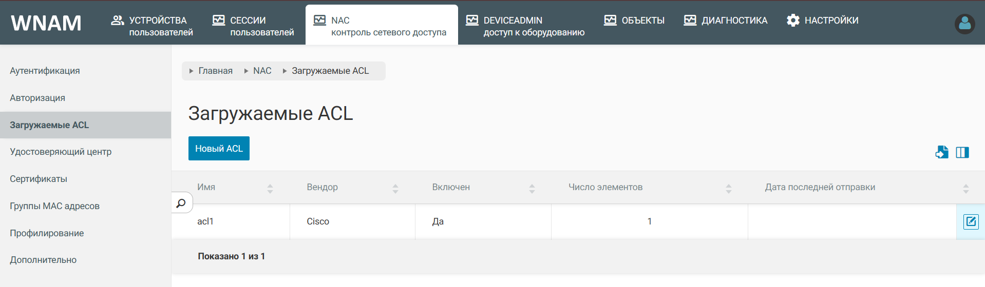 Для того, чтобы создать списки, необходимо перейти в раздел "NAC контроль сетевого доступа" → "Загружаемые ACL", где можно сформировать список управления доступом или просмотреть уже загруженные списки.