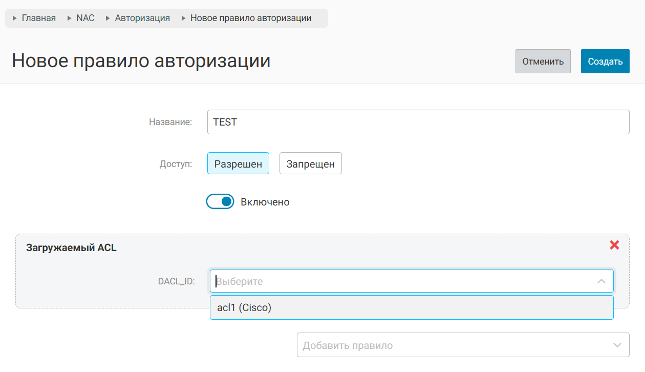 Созданный ACL можно применить в настройке требуемого правила авторизации.