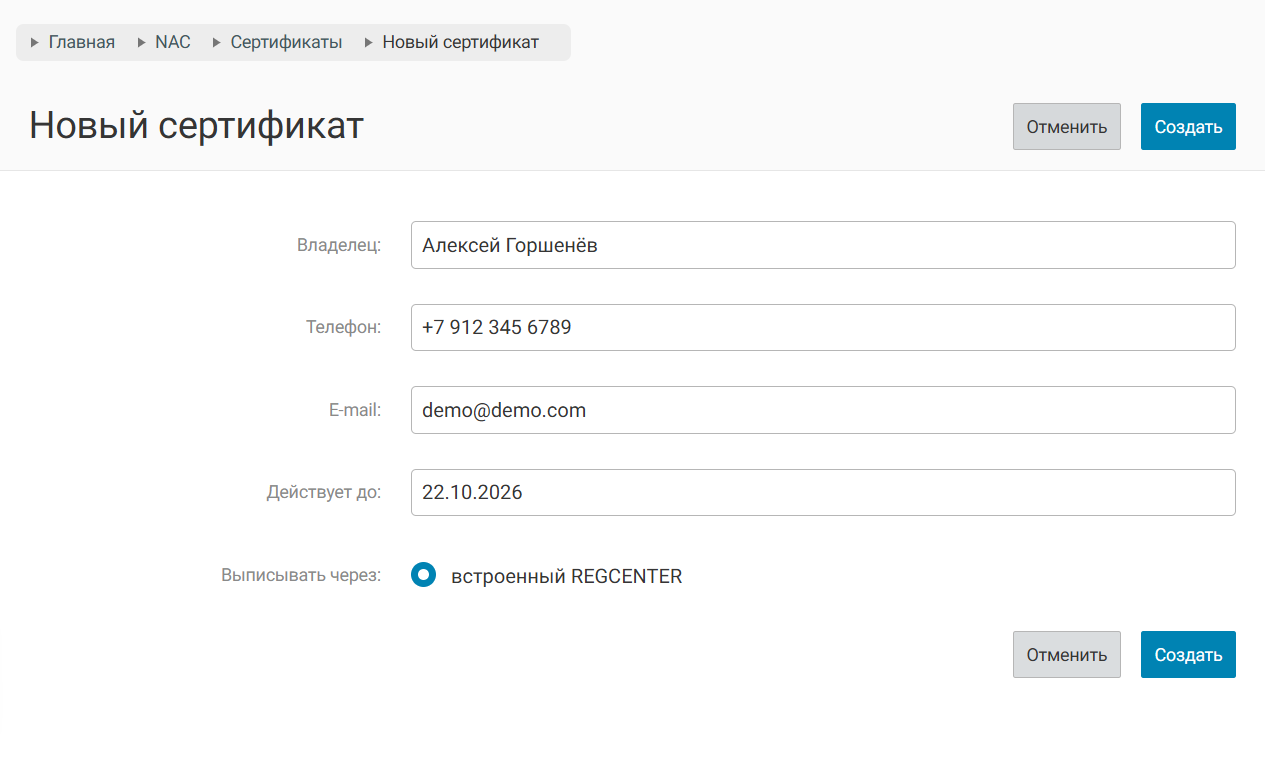 Если в вашем Удостоверяющем Центре WNAM 2 есть хотя бы один сертификат типа REGCENTER (с закрытым ключом), вы можете вручную создавать в нём сертификаты для абонентов, которые будут проходить авторизацию подключений через EAP-TLS. Для этого в меню "NAC контроль сетевого доступа" → "Сертификаты" необходимо нажать кнопку "Новый сертификат" и заполнить все поля (наименование владельца сертификата, номер телефона и e-mail). После заполнения всех полей следует нажать кнопку "Выписать"