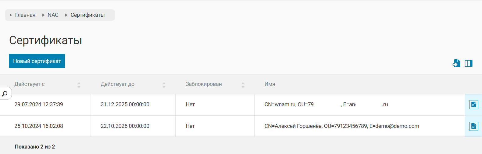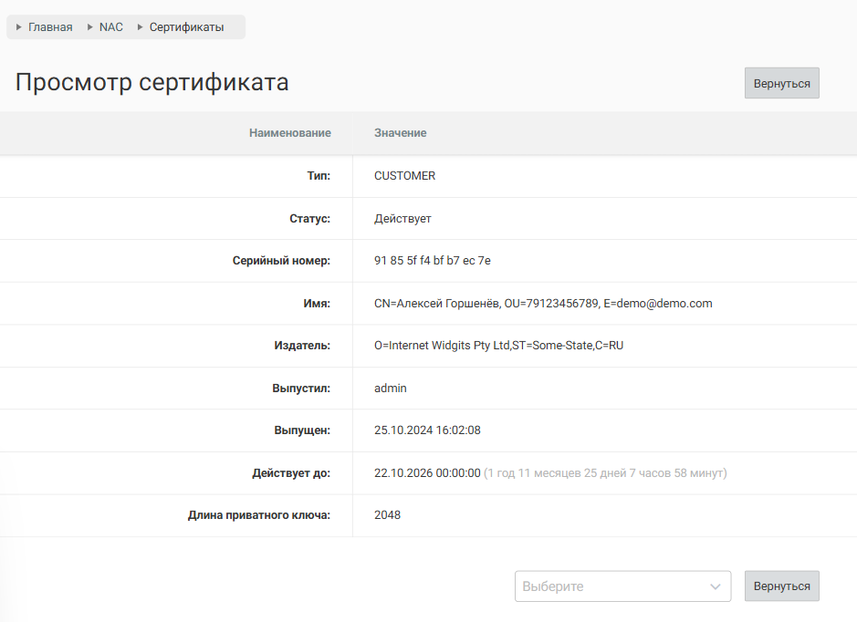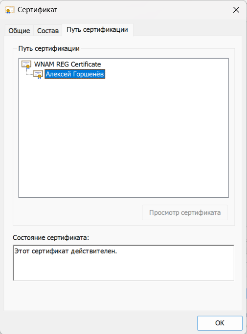 Видно, что созданный сертификат выпущен встроенным в систему WNAM 2 регистрационным центром.