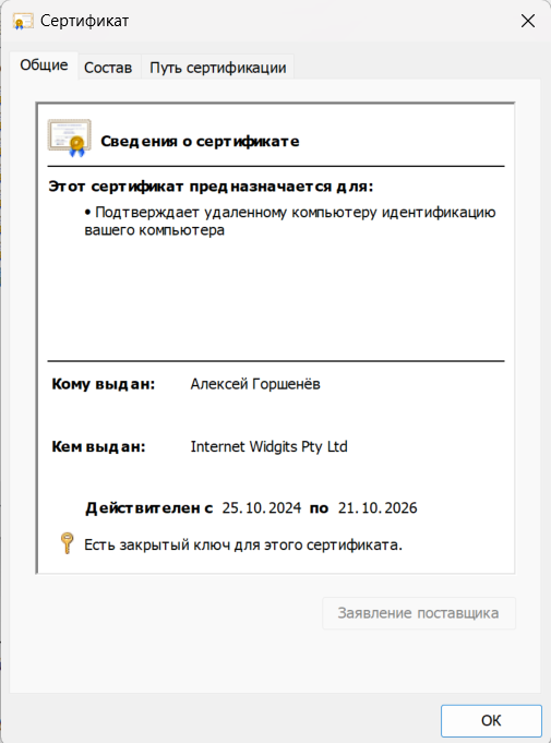 - посмотреть сертификат (будет открыто окно с текстовым представлением сертификата);