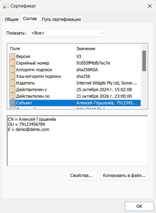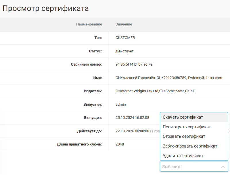 Также можно просмотреть свойства созданного сертификата, выгрузить сертификат (с ключом) в формате PFX и передать его пользователю. Для этого следует нажать на контекстное меню "открыть подробности" выбираемого сертификата.