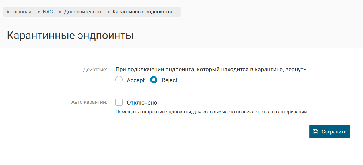 Действие – Определяет, разрешить или отклонить подключение эндпоинта. При опции "Accept", необходимо указать, какие RADIUS атрибуты будут переданы эндпоинту.