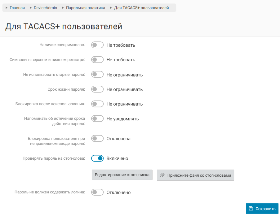 Данный раздел можно найти по пути "Главная" – "DEVICEADMIN" – "Парольная политика". Также присутствует разграничение для TACACS+ пользователей и для технических TACACS+ учетных записей.
