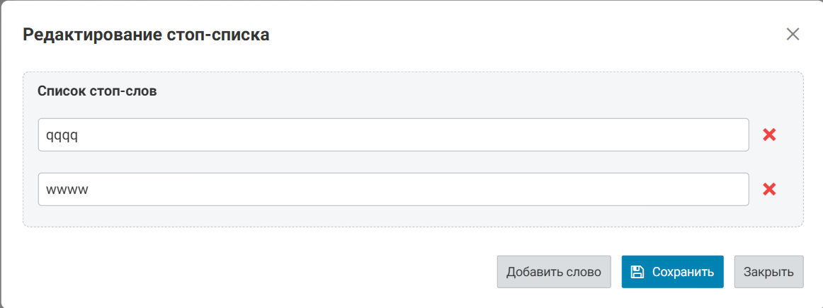 - Фильтр паролей на стоп-слова. В данной настройке возможно импортировать список стоп-слов из файла, либо редактирование списка напрямую;