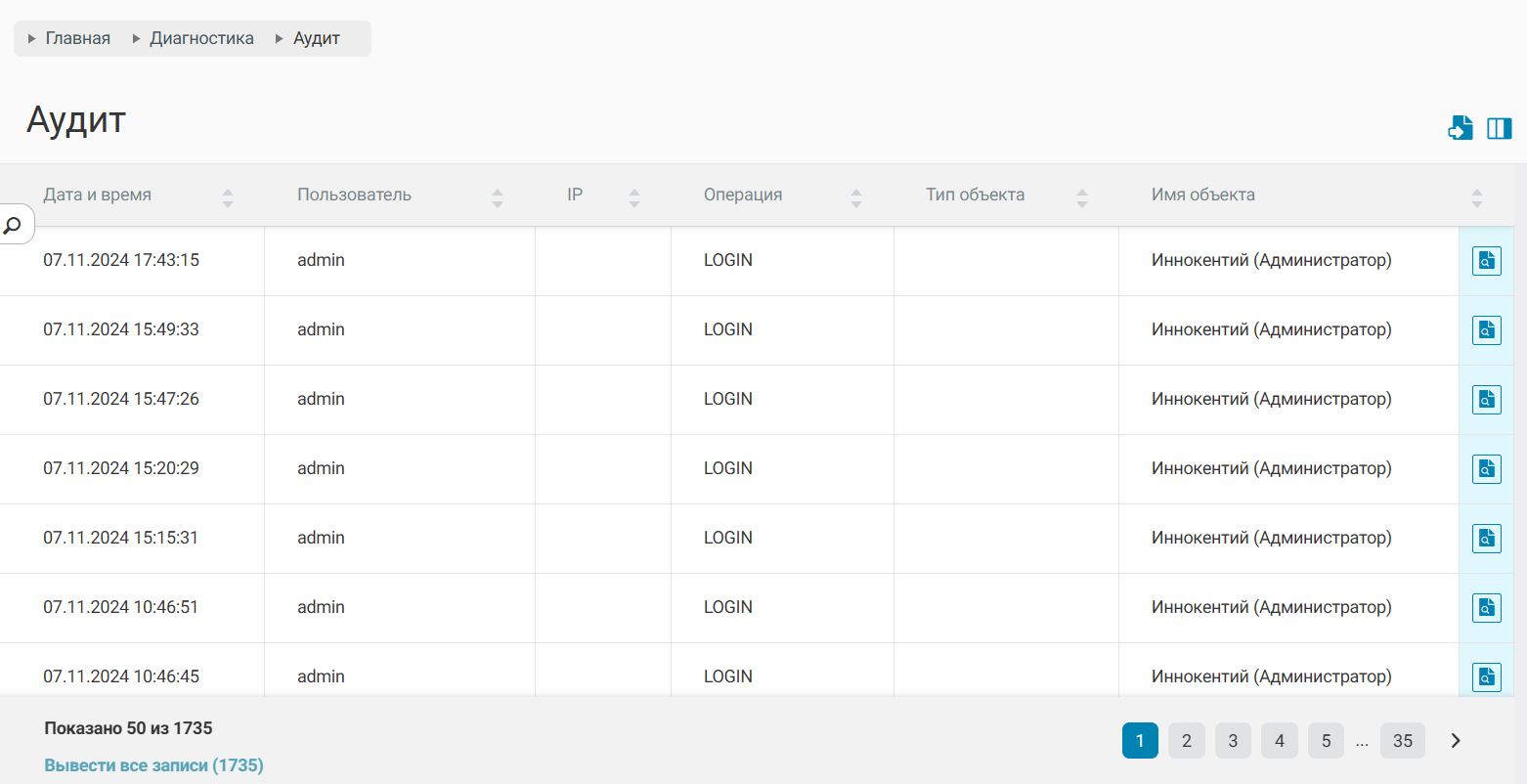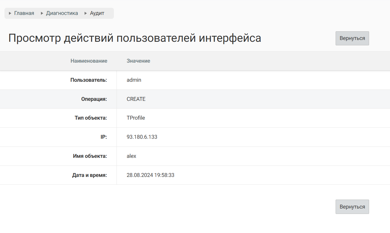 Раздел аудита позволяет отобразить все действия пользователей веб-интерфейса системы WNAM 2 (администраторов, менеджеров) по логину и по созданию/изменению/удалению объектов различного типа. Для того, чтобы просмотреть статистику действий пользователя необходимо перейти в раздел "Диагностика" → "Аудит". В открывшемся окне будут доступны записи по каждому пользователю., отображающие имя пользователя, совершенную операцию, время операции, IP-адрес устройства, тип и имя объекта. Система WNAM предоставляет возможность фильтрации по времени, за которое необходимо просмотреть информацию, а также поиск по ряду полей таблицы.