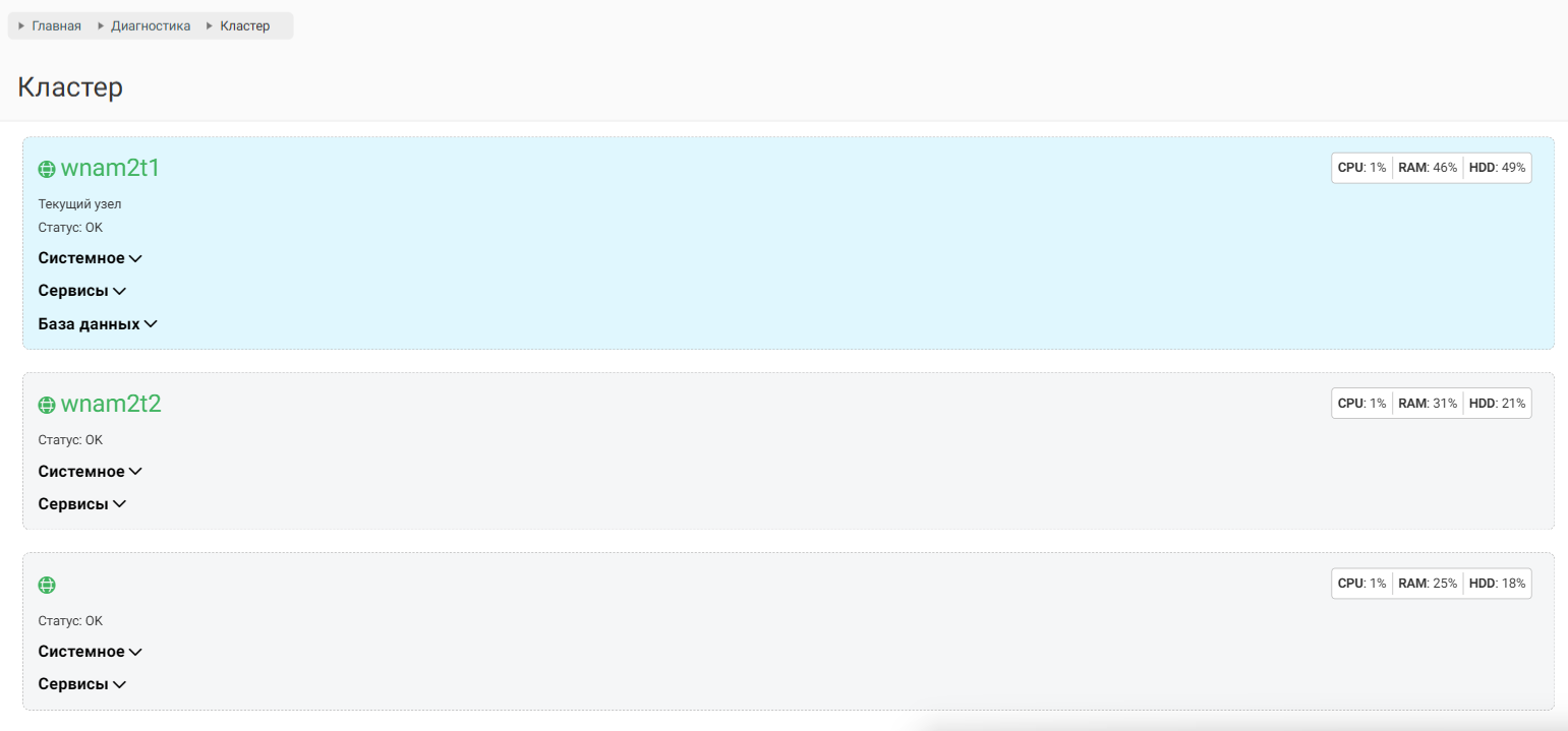 Чтобы просмотреть информацию о подключенных кластерах, достаточно перейти в раздел "Диагностика" – "Кластер". В этом разделе собрана вся статистическая информация, показатели нагрузки, статус и другие свойства, которые будут описаны ниже.
