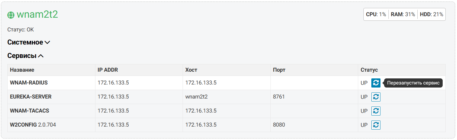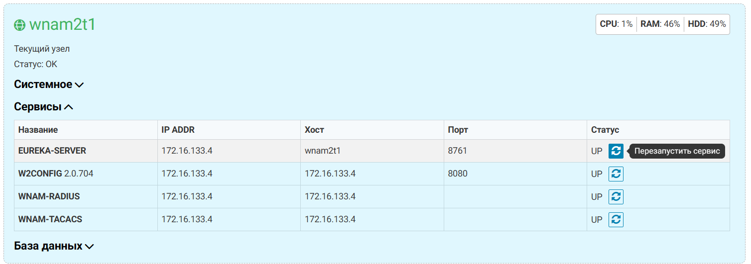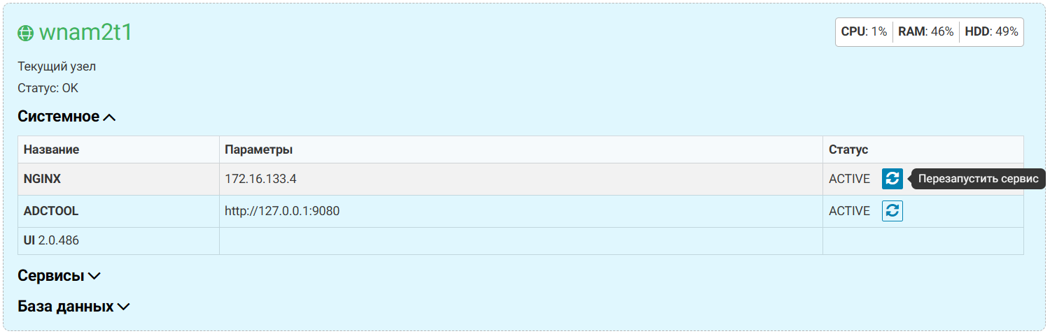 Первым всегда отображается тот кластер, который используется. У каждого кластера (узла) можно просмотреть какие процессы запущены (Системные и сервисы, у кластера, который используется также отображается используемая база данных) и при необходимости также присутствует возможность перезапустить тот или иной сервис. Для этого, необходимо открыть требуемый раздел и в таблице выбрать сервис после чего нажать на кнопку перезапуска.