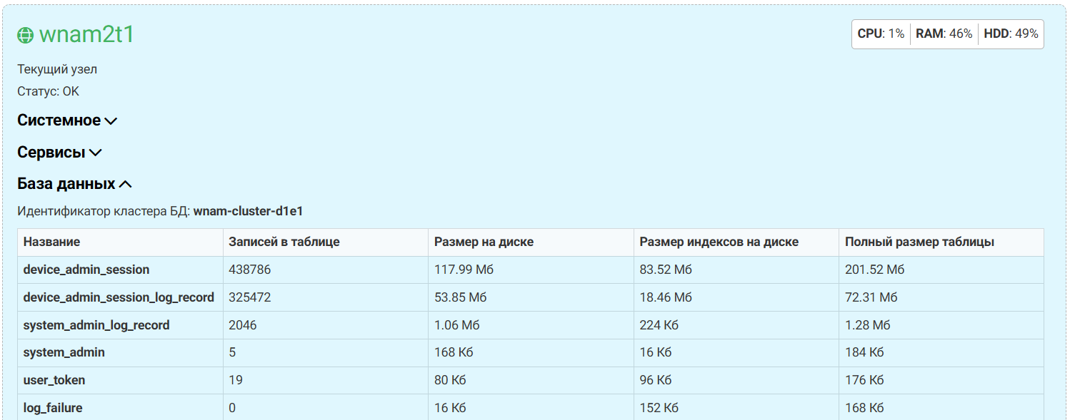 Логика отображения и функционал остальных кластеров симметрична текущему, но без возможности отображения раздела базы данных.