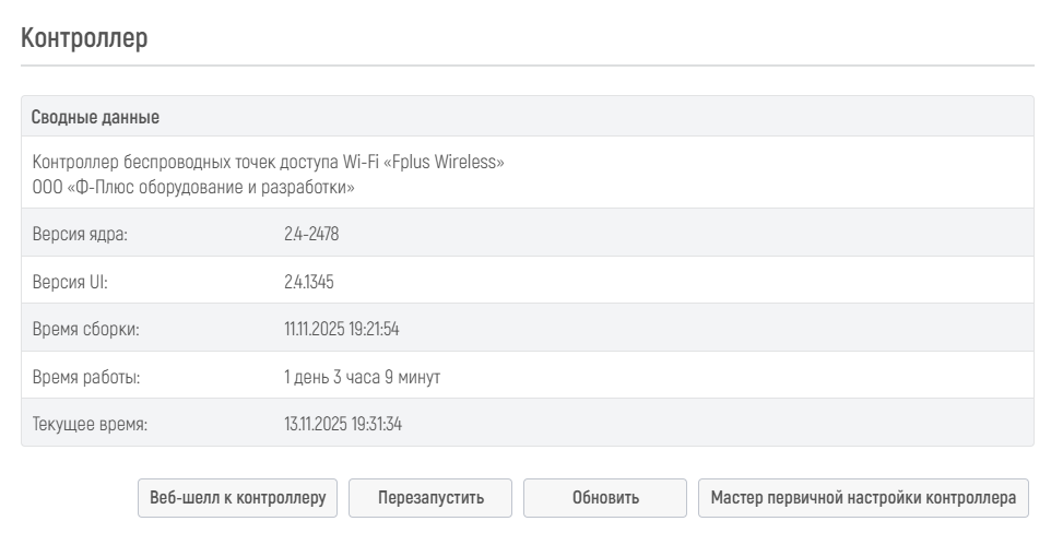 В разделе "Контроллер" представлена основная информация по работе контроллера, его настройки, а также возможность выполнения различных действий по настройке и управлению контроллером.