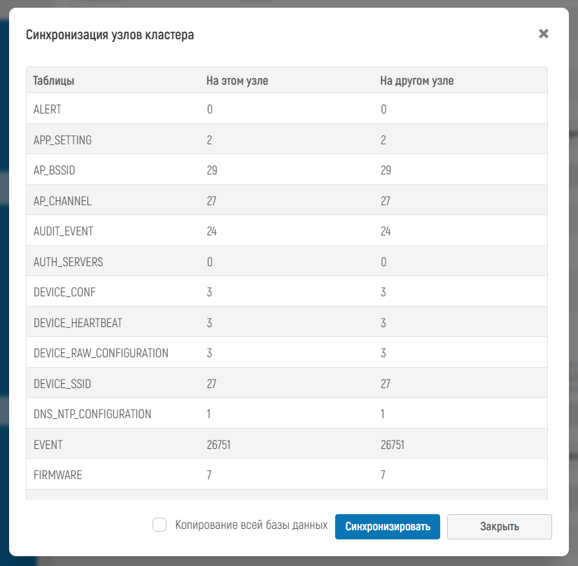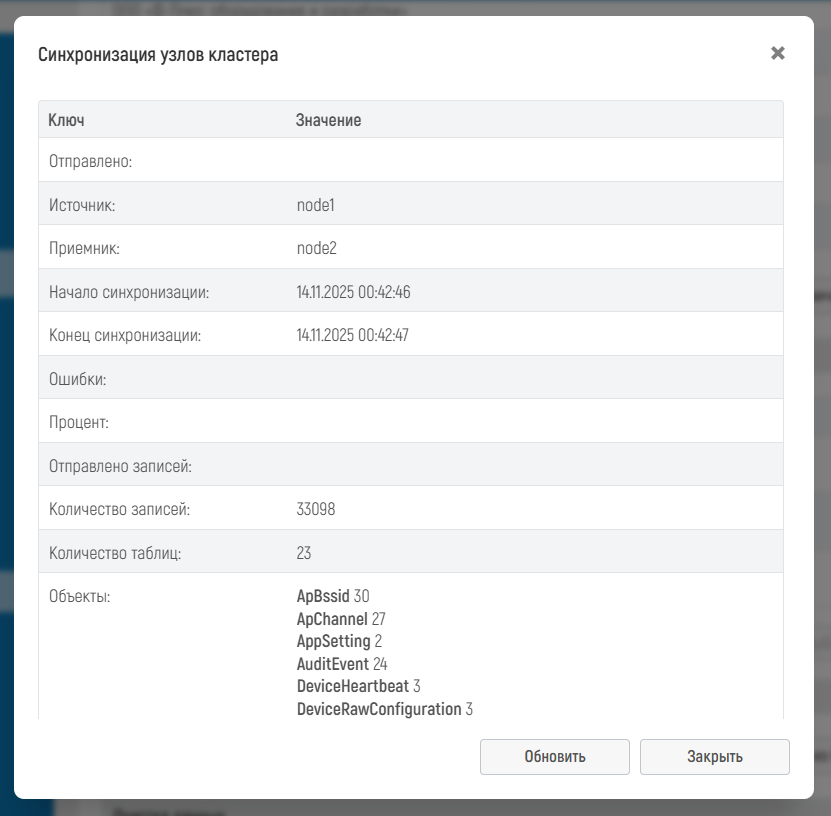 - Синхронизация кластера - позволяет просмотреть информацию о синхронизации базы данных между узлами кластера и запустить ее;